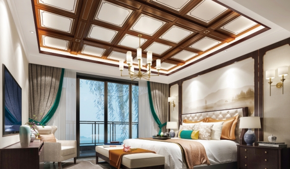 素净通透的卧室,以大落地窗接纳来自自然的悸动。顶部的大板吊顶更是加深了整个空间的视感维度,成为空间最惹眼的存在。